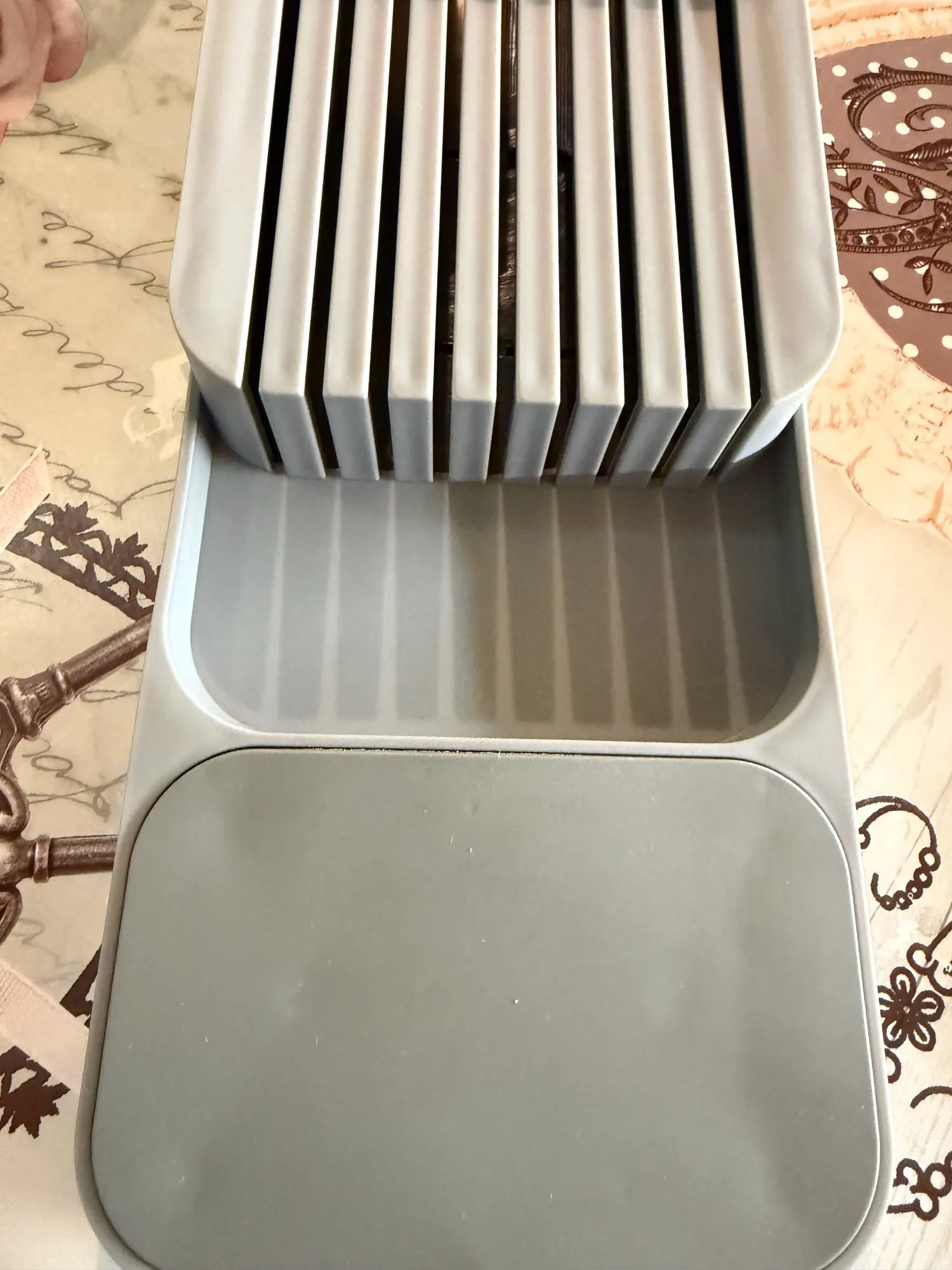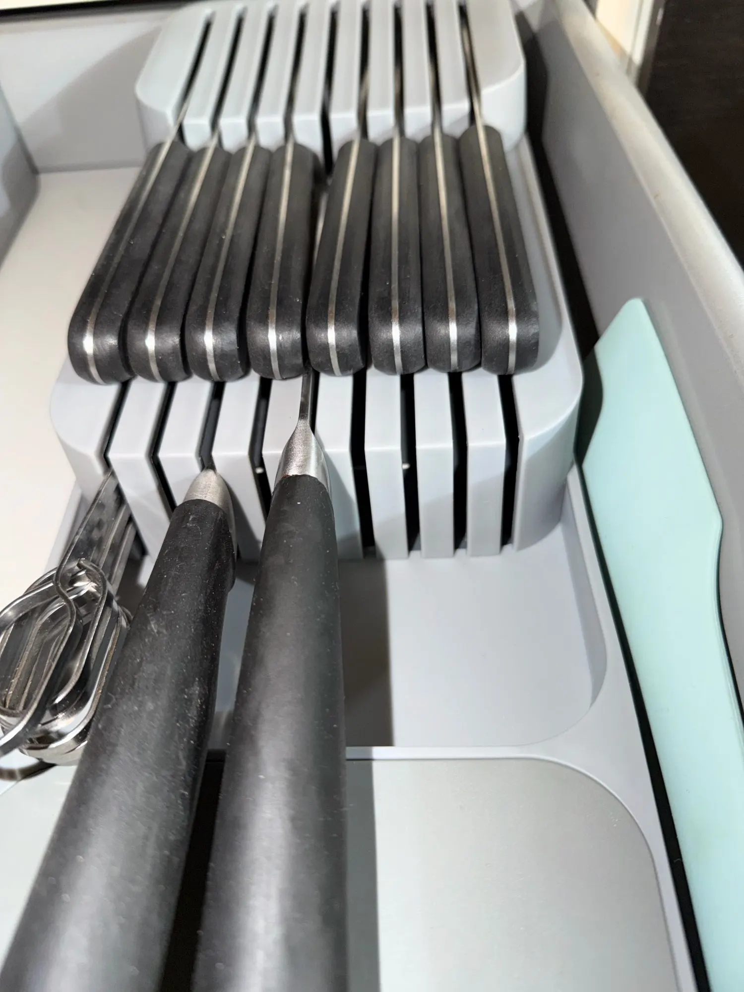 The sides are well made, the images match, where the blade fits is much more flexible and lightweight but it performs its function perfectly. The knives remain stable, perfect for serving steaks and kitchen use; longer knives fit well, the blades stay in place and do not lift, neither the blade nor the handle. Fully satisfied. In the final part where the handle rests, there is a silicone mat only at the lowest part. The delivery was very fast. Thank you. 😊 . Very good product, the knives do not come out and remain stable inside the drawer. Finally a knife holder where you don't have difficulty opening the drawer. Of course, if you have the right height measurements, I must say that it is one of the lowest ones I've found, so I think it easily fits into many kitchen drawers for cutlery, even if they are low. I highly recommend this very useful product for organizing cutlery in the kitchen drawer.
