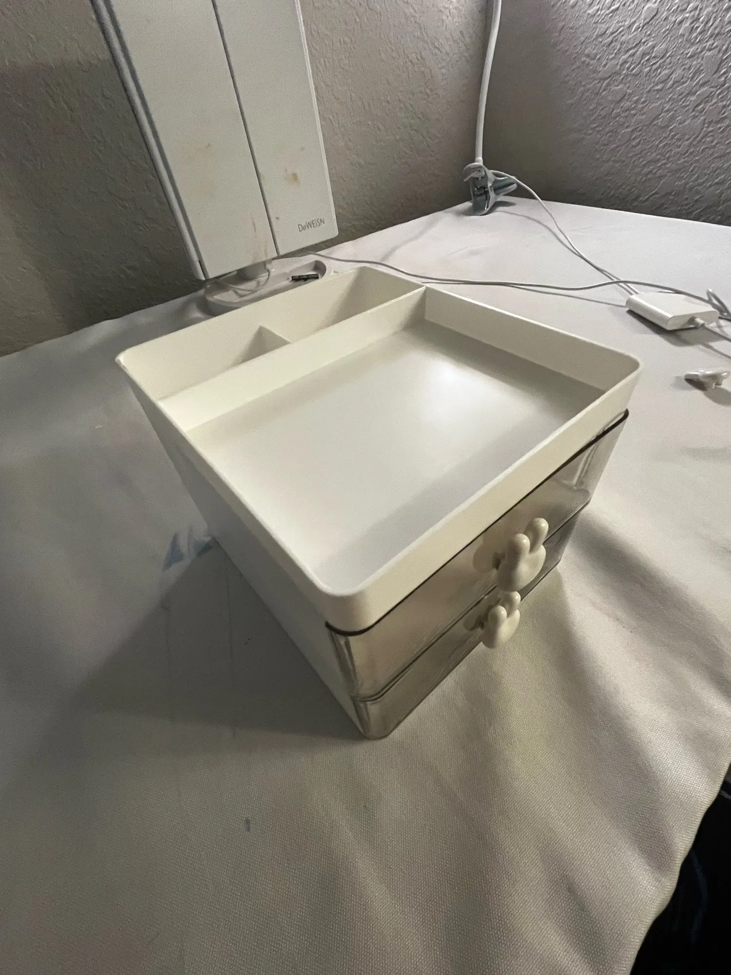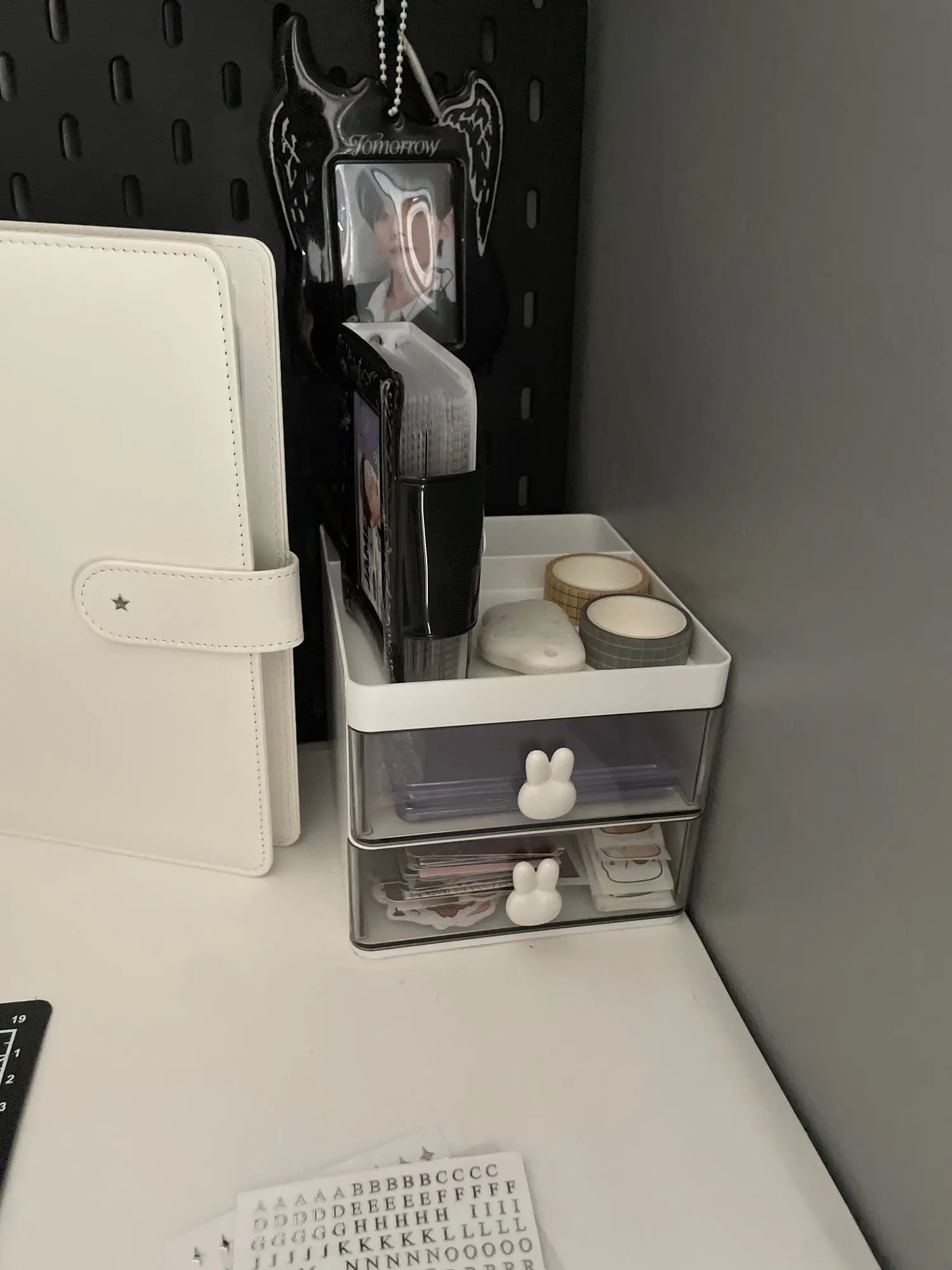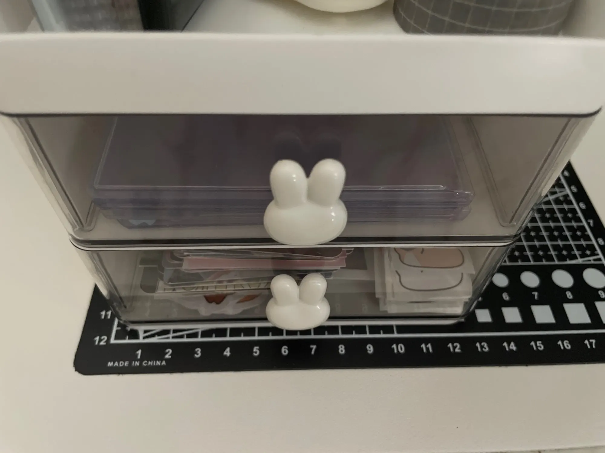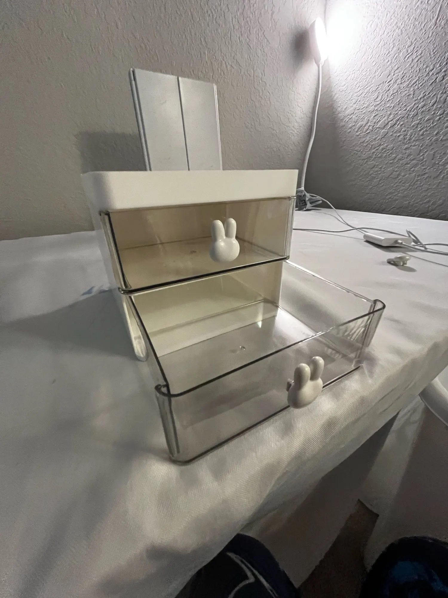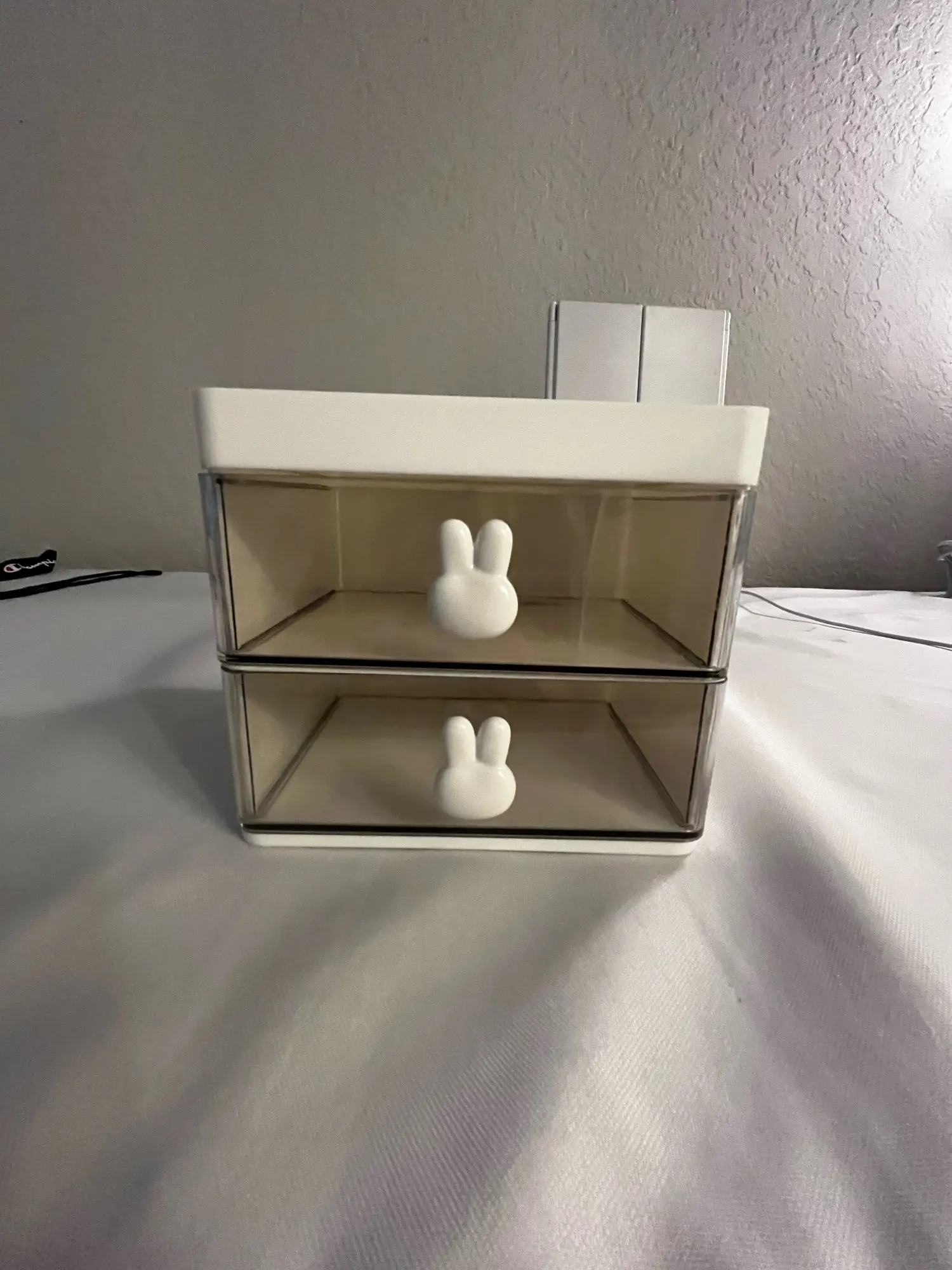 The organizer is so cute and is great for storing supplies, its a bit small but the space at the top makes up for it. The delivery came two weeks earlier than expected which was great!! It came with 3 bunny charms tho one of them was scratched but i used the other two so it was okay, the top tray was a little scratched as well but its acceptable given the cheap price, overall i recommend! !